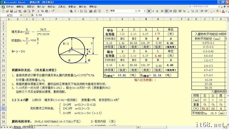 如下圖:有效半徑D和有效倉長L是已知數(shù),試用輸入球面凈空高y的數(shù)據(jù)可得出你要求的填充率&,同時也得出了研磨體的填充量。(凈空高與填充率基本是同一個概念,而凈空高在實際生產(chǎn)中更實用,說不定哪天就要打開磨門量一下,補上一些鋼球。H缓蟾鶕(jù)入磨材料的粒徑求出平均球徑,根據(jù)平均球徑的要求以“兩頭小中間大的原則”可得出各種球體的級配。而這些求解方法都可以利用Excel的自動計算功能設定后方便地進行。