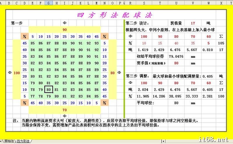 第一步:設定四種連續(xù)規(guī)格的研磨體,按照四方形的分配原則,它們的總和是100%。如下圖,可得出平均球徑的結(jié)果,有幾組級配不同但平均球徑結(jié)果相同的組合,根據(jù)工藝生產(chǎn)要求選取合適的級配。(可設定自動統(tǒng)計表,只需輸入四種研磨體的規(guī)格直徑,即可得出一系列的平均球徑結(jié)果)。